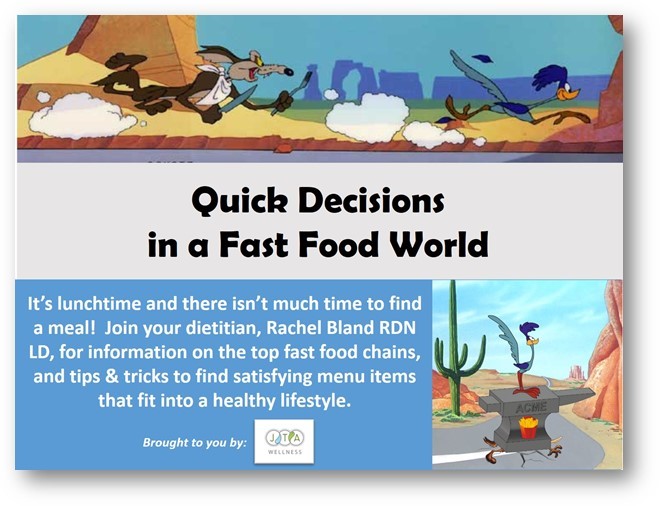 It’s lunchtime and there isn’t much time to find a meal! Join your Dietitian, Rachel Bland RDN, LD, for information on the top fast-food chains, and tips and tricks to find satisfying menu items that fit into a healthy lifestyle.